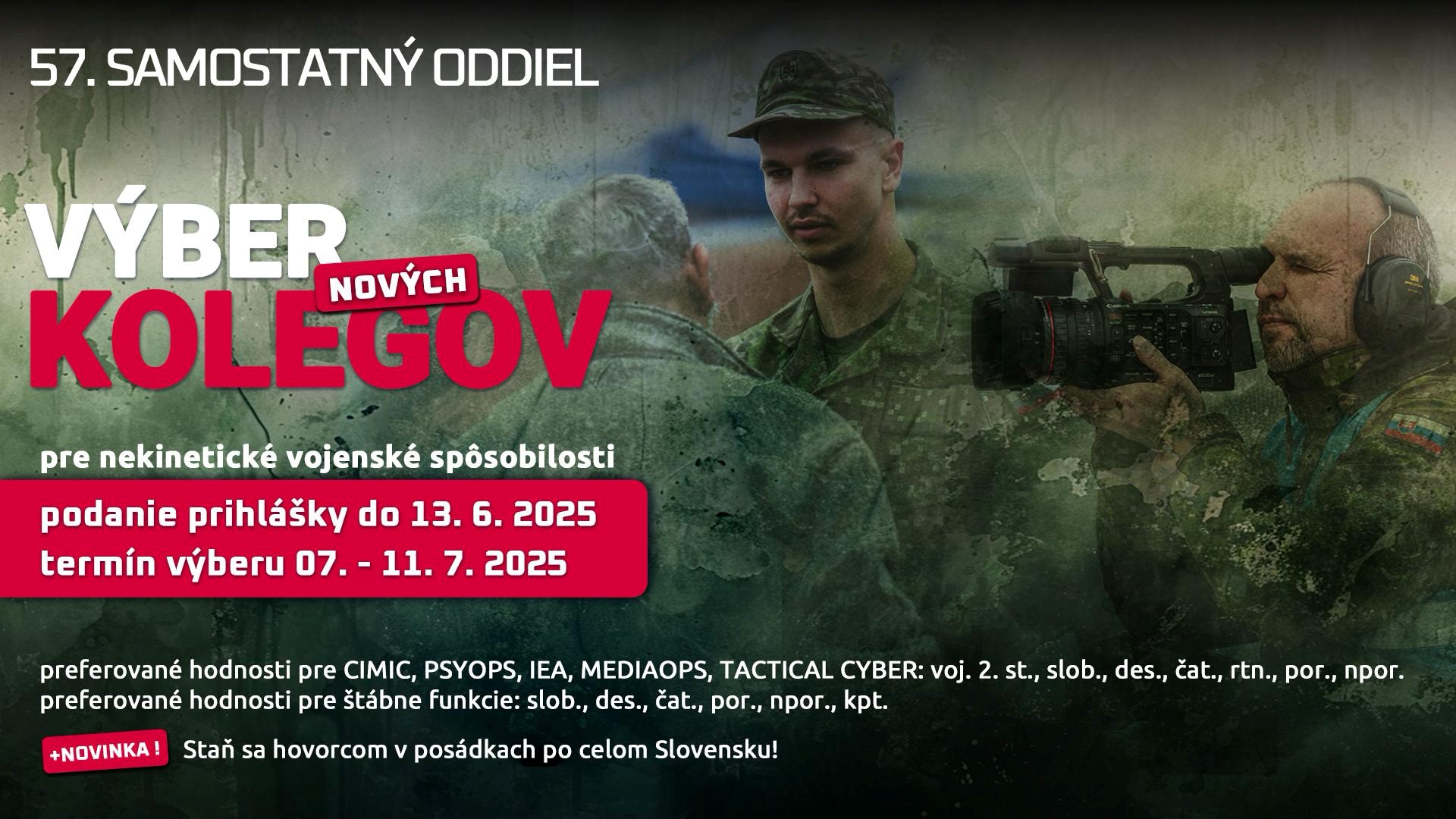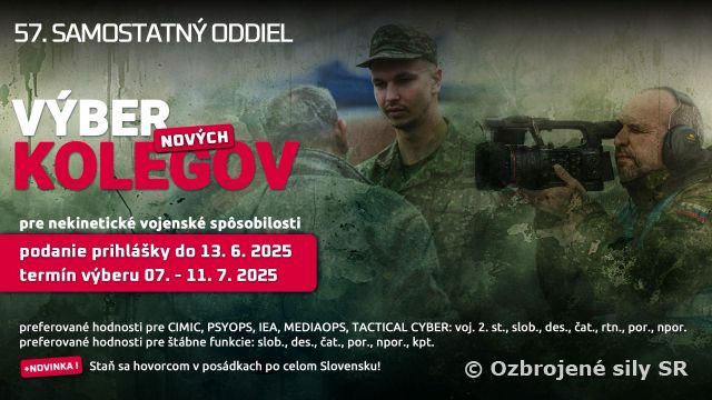 NOVINKA! Staň sa hovorcom vo vojenskej posádke - otvárame 17 dôstojníckych pozícií s plánovanou hodnosťou major a s miestom výkonu štátnej služby po celom Slovensku. Viac informácii na slide č. 15 a č. 16 v súbore ´výber 57._samo_07_2025.pdf´